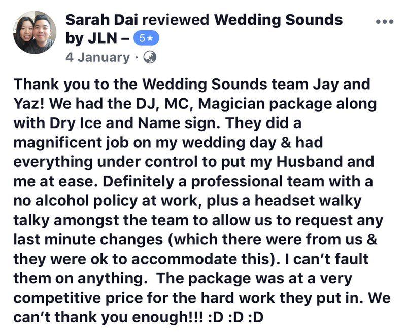 Melbourne couples consistently give Wedding Sounds 5-star Google reviews for our exceptional celebrant, DJ and MC services. As trusted Melbourne wedding professionals, we’re known for delivering personalised ceremonies, high-energy receptions, and stress-free wedding day coordination. Our experienced Melbourne wedding celebrants craft heartfelt, meaningful moments, while our wedding DJs create the perfect soundtrack to keep the dance floor full. Combined with our polished wedding MC services, couples love how we bring professionalism, fun, and seamless flow to every part of their big day. Want to know what makes us one of the most recommended wedding vendors in Melbourne?